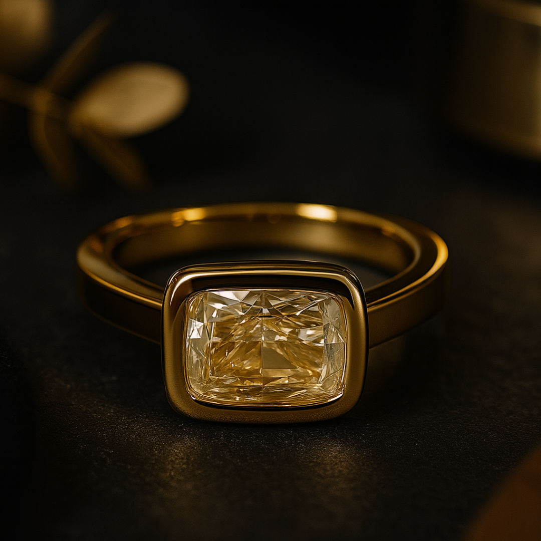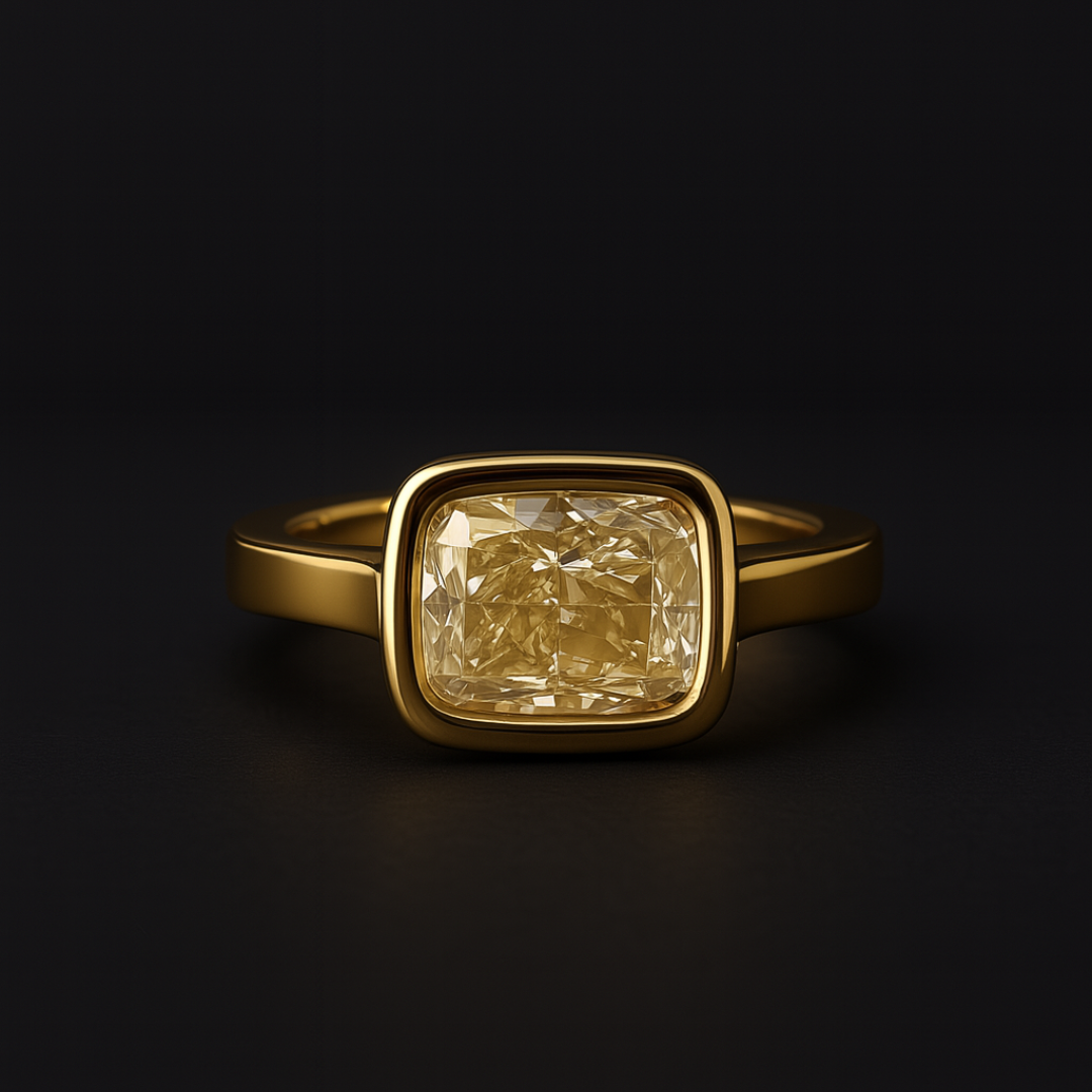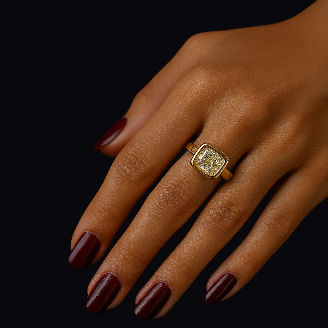 The Soleil Moderne ring is a celebration of sculptural simplicity and diamond brilliance. At its centre lies a hand-selected, 1.71 carat cushion-cut natural diamond, known for its soft edges and captivating internal fire. Framed in a full bezel of 18K yellow gold, the setting is both protective and bold — a seamless halo that reflects light inwards, enhancing the diamond’s natural luminosity.